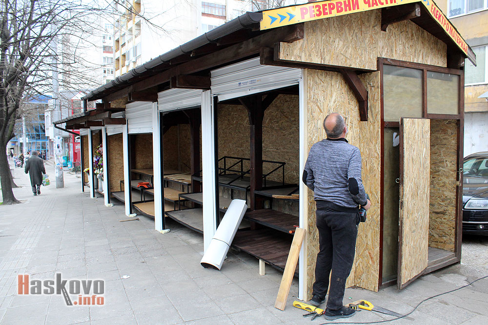 Търговците на пазарчето на булевард „Раковски“ в Хасково си затварят масите срещу вятър и студ. Част от стоката им ще се заключва там през нощта.