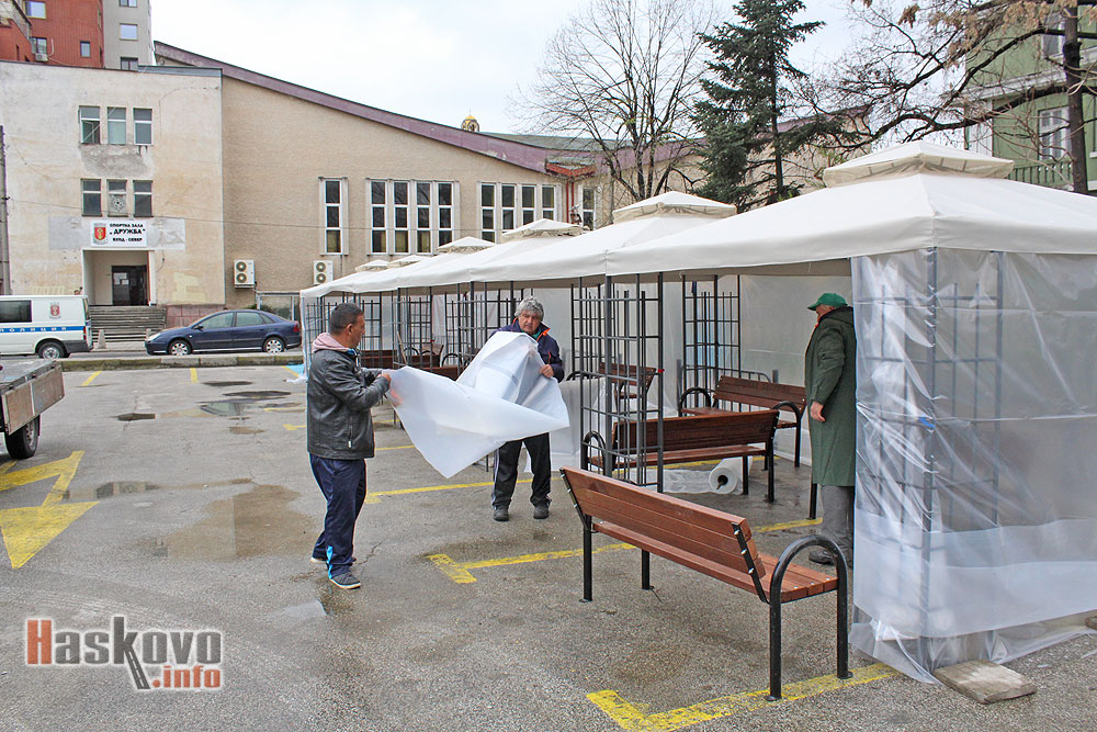 Поставиха шатрите и химическите тоалетни за членовете на СИК до спортна зала „Дружба“, където се намира РИК – Хасково.
