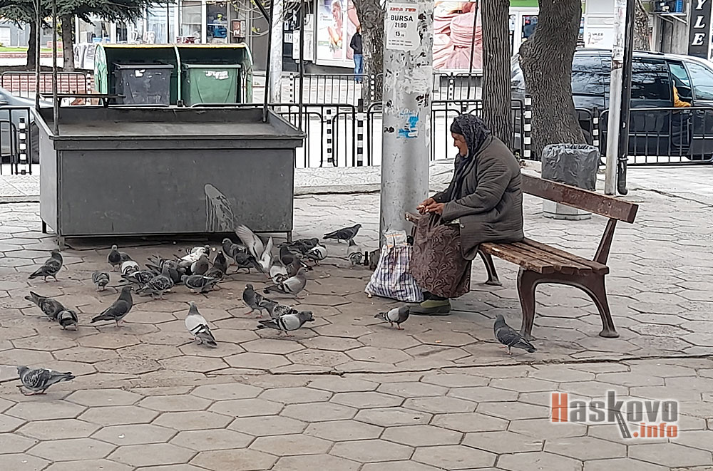 Възрастна жена храни гълъбите на автогарата в Хасково.
