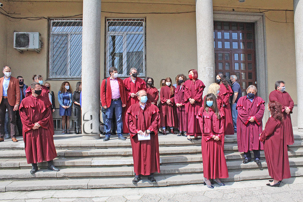 Прокурори, следователи и съдебни служители излязоха на мълчалив протест пред сградата на съдебната палата в Хасково. По същото време това направиха и колегите им в цялата страна.