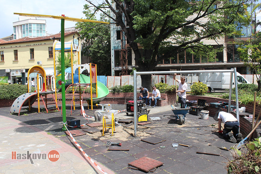 Ремонтират стари люлки на детската площадка в паркчето срещу театъра в Хасково.
