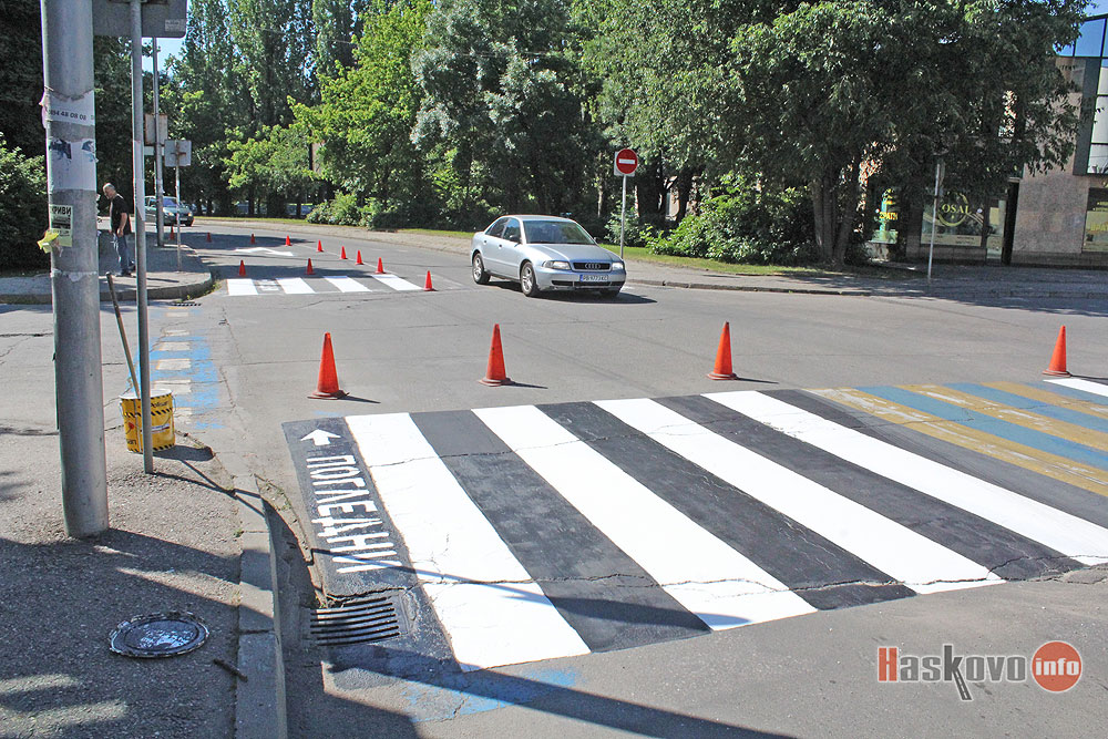 Работници освежават маркировката по булевард "България" в центъра на Хасково.