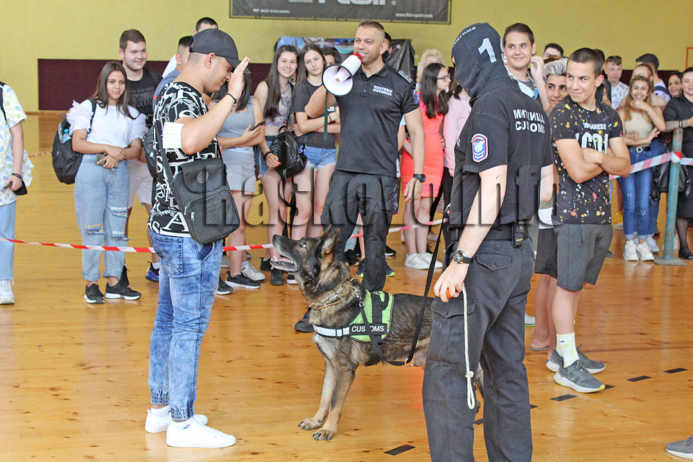 Демонстрация пред ученици как митнически кучета откриват дрога, скрита в куфари и чанти, направиха от отдел „Борба с наркотрафика“ на Агенция „Митници“ в хасковската спортна зала „Спартак“.