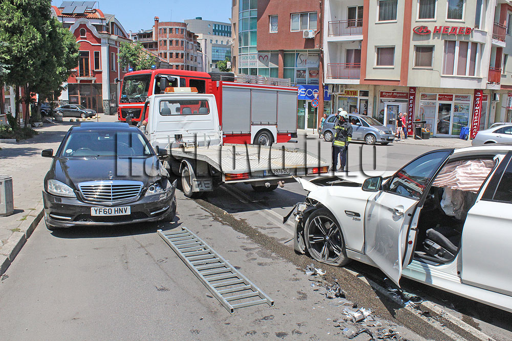 Лек автомобил БМВ е завил наляво от „Панорама“ и при включването си по булеварда е навлязъл в насрещното и се е ударил в Марцедес. Очевидци разказаха, че първи на инцидента са се отзовали от пожарната, които веднага са спрели движението.