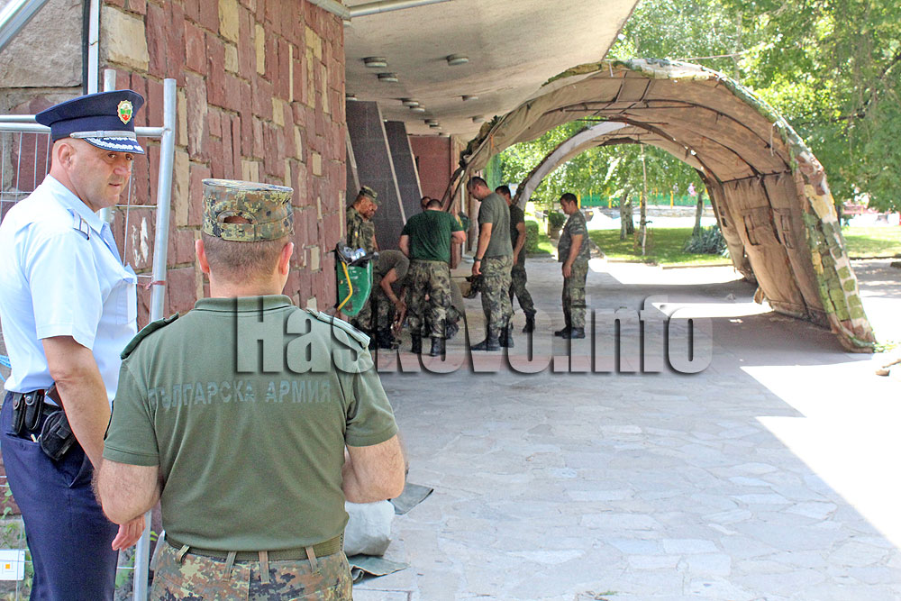 Две големи военни палатки бяха монтирани пред спортна зала „Дружба“, където се помещава Районната избирателна комисия в Хасково. Както Haskovo.info писа, вчера в самата зала бяха подредени масите и столовете.
