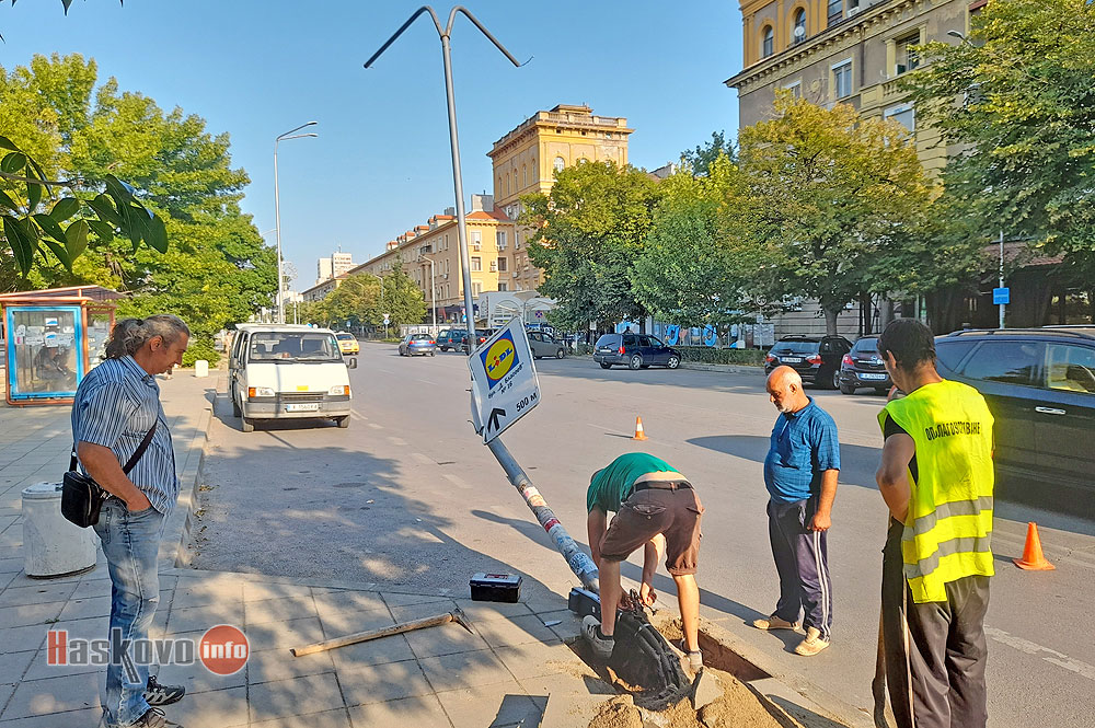 Работници подменят уличен стълб, съборен при катастрофа с материални щети до новата автогара в Димитровград.