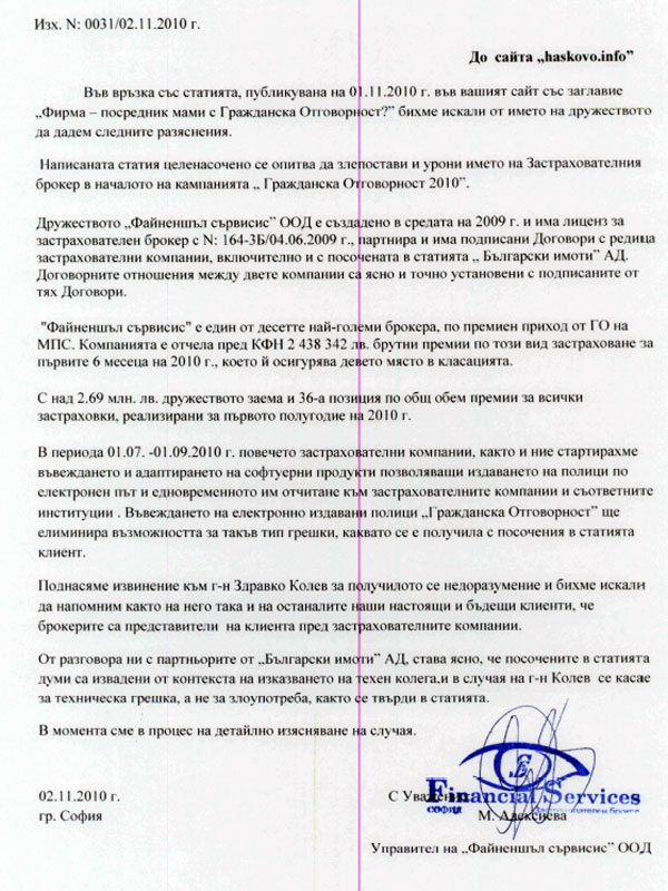От „Файненшъл сървисис“ днес изпратиха писмо до Haskovo.info, в което се извиняват на Здравко Колев за получилото се недоразумение. Според тях „въвеждането на електронно издавани полици ще елиминира възможността за такъв тип грешки, каквато се е получила с посочения в статията клиент“.