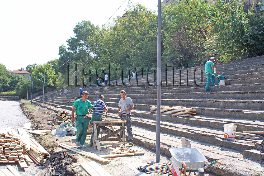 Ремонтът се извършва от общинското предприятие „Екопрогрес“ и беше анонсиран от кмета Станислав Дечев на сесията на общинския съвет в края на миналата седмица. Идеята е трибуните да бъдат ремонтирани паралелно с работата лекоатлетическата писта и терена.