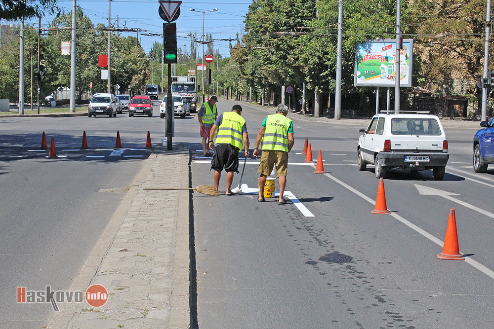 Работници на „Екопрогрес“ освежават маркировката на кръстовището до бившата цигарена фабрика в Хасково.