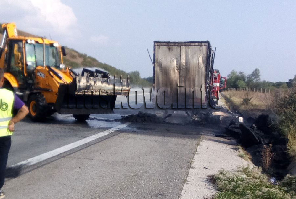 От полицията съобщиха, че камионът, собственост на хасковска фирма, се е запалил в движение от задната дясна гума на ремаркето. 43-годишният шофьор от кърджалийското село Ястребово е успял да откачи влекача от ремаркето и го е изтеглил на безопасно разстояние. Изгоряло е ремаркето, натоварено с платове и метални профили. Предстои назначаване на експертизи за установяване причините за самозапалване на ремаркето.