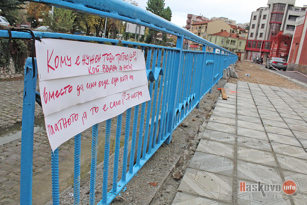 Плакат, поставящ под въпрос нуждата от тротоар край реката в района на театъра в Хасково се появи на парапета. В момента там се извършва ремонт и предстои отново да бъдат засадени тополи. Неизвестният автор пита „На кого е нужен този тротоар“ и посочва, че по-добре би било да има още една лента за автомобили.