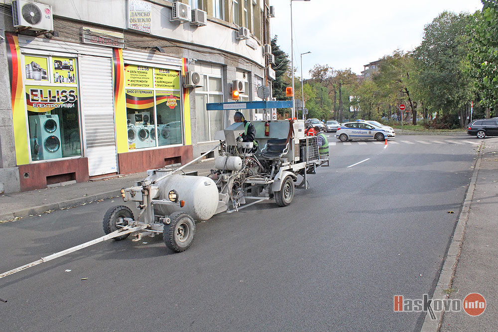 Полицаи временно затвориха преасфалтирания участък от хасковския булевард „България“ покрай театъра за полагането на нова маркировка.
