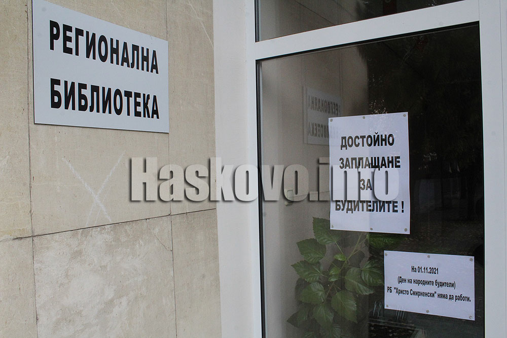 Регионалната библиотека „Христо Смирненски“ не работи на празника. На входовете й обаче са поставени бележки с текст „Достойно заплащане за будителите“. 20 са библиотекарите в РБ „Христо Смирненски“ в Хасково.