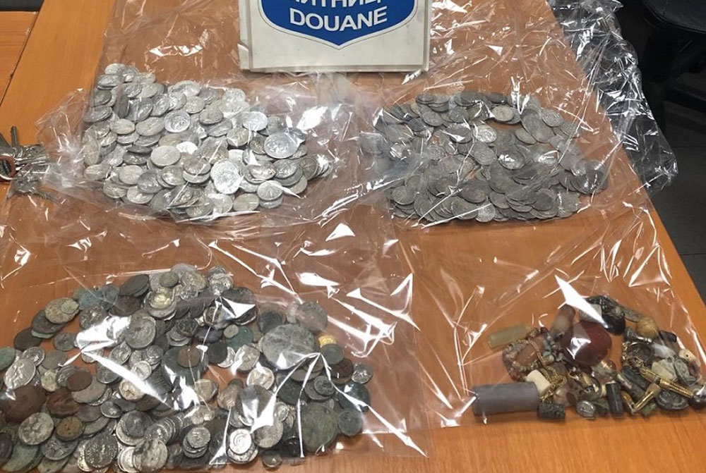 При извършената проверка митничарите обаче откриват под акумулаторите на камиона укрити 5 пакета, опаковани с тиксо. Установено е, че те съдържат 716 старинни на вид монети от бял и цветен метал, както и 45 броя старинни накити и предмети, сред които пръстени, медальони, обеци, фигурки, плочки, печати, два овални червени камъка.
