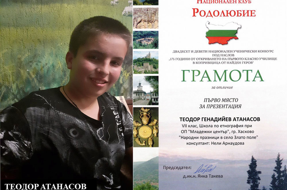 Първо място за презентацията „Народни празници в село Злато поле“ и право да кандидатства за едногодишна стипендия по програмата на МОН за насърчаване на творческите способности на децата завоюва Теодор Генадийев Атанасов, ученик от 8 клас в ПГДС „Цар Иван Асен II“. Трето място за презентацията „Огнища на знания и духовна пробуда в Хасково“ спечели Теодор Любомиров Георгиев в 7 клас от ОУ „Св. Иван Рилски“. Първо място за реферата „Българките в борбите за свобода“ и право да кандидатства за едногодишна стипендия по програмата на МОН за насърчаване на творческите способности на децата заслужи Вяра Иванова Петрова в 8 клас в ЕГ „Проф. д-р Асен Златаров“.