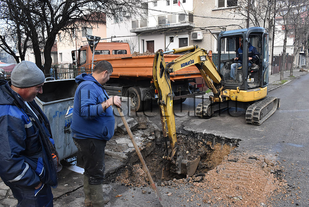 Спукал се е старият етернитов водопровод. Преди обяд екип на ВиК започна да разкопава улицата, за да отстрани аварията. Безводието е в отсечката от кръстовището с улица „Дунав“ до училище „Васил Левски“.