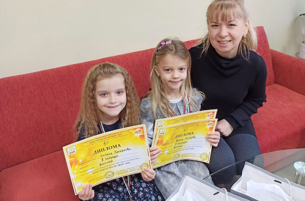 Даяна участва в две категории, а Симона в една. Техен учител по музика в детската градина е Фанка Койнарова – Вълчанова. Директорът на „Слънце“ Анна Йорданова връчи на момичетата медалите, грамотите и подаръци от детската градина с пожелание за здраве и още много успехи. Това са поредните отличия за талантливите деца на градината.