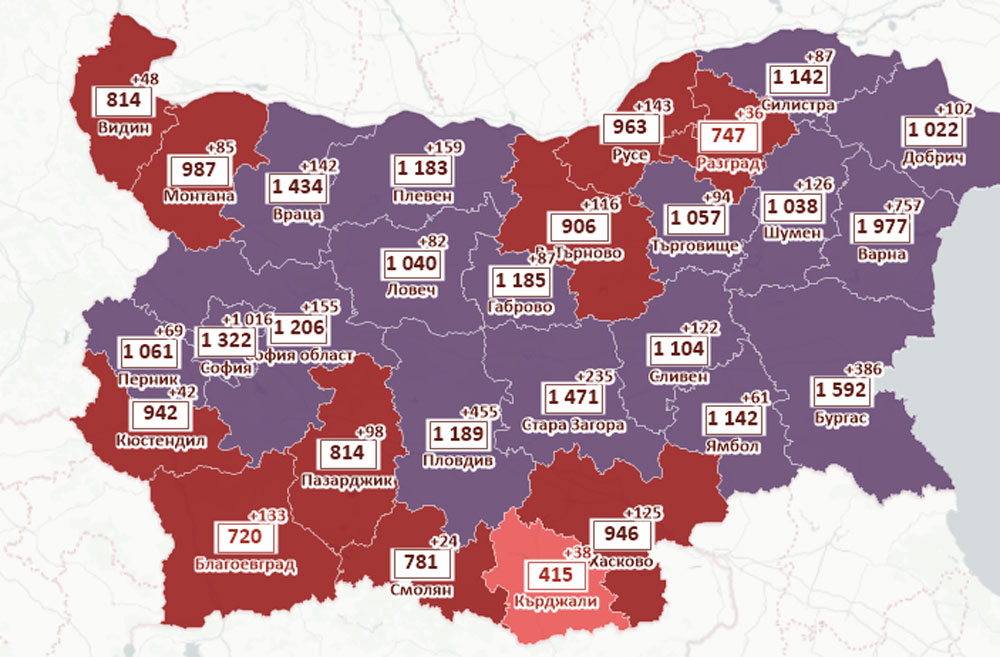 Хасковска област излезе от лилавата зона, като 14-дневната заболеваемост вече е под 1 000 на 100 000 души – 946 на 100 000.