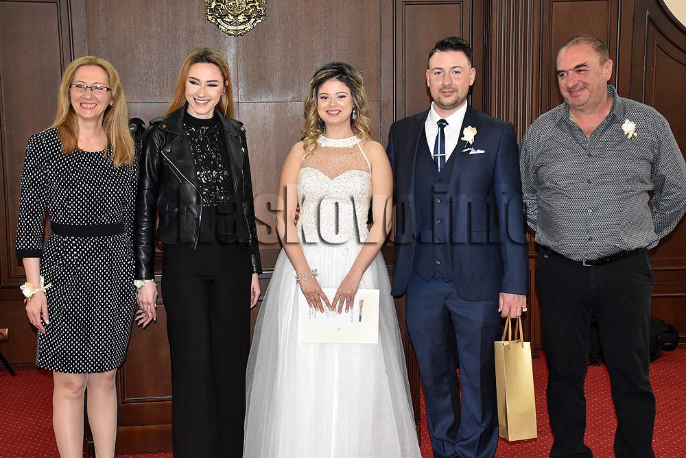 Първи „Да“ си казаха Кристина Радева и Красимир Димитров. Техни кумове са Николета Падърова и Емилиян Душев. Младоженците казаха, че са заедно от 8 г. Те са решили да сключат брак днес още през миналата година, защото вярват, че това е ангелска дата, която носи късмет.