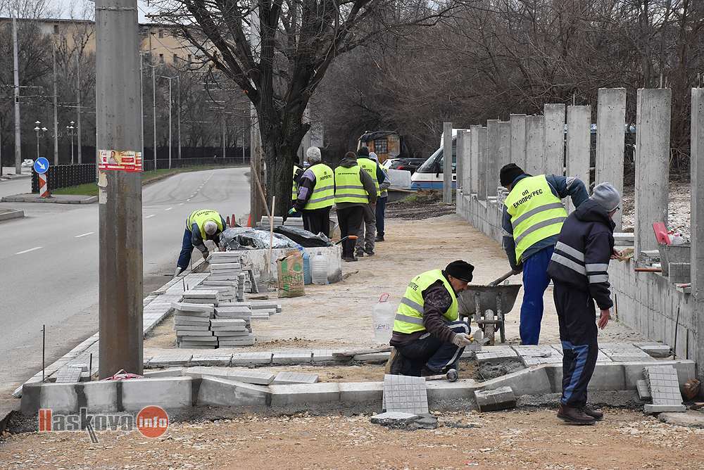 Работници на общинското предприятие „Екопрогрес“ ремонтират тротоар на булевард „Васил Левски“ в Хасково.