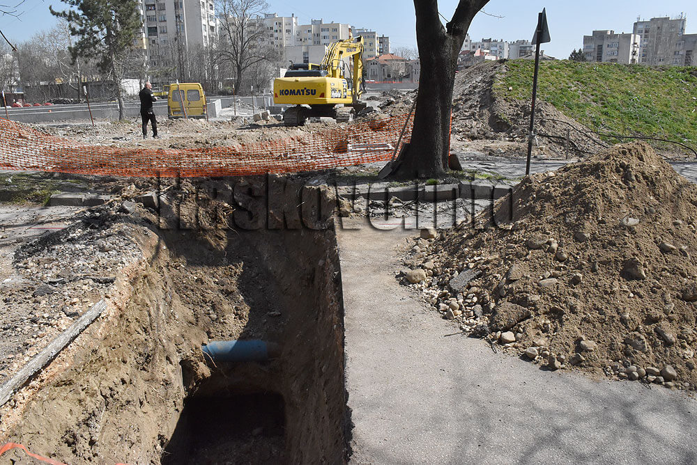 Причината е изграждането на връзка за канализацията на новостроящия се парк зад ДНА. Там работата е подновена, като вече се обособяват и алеите.