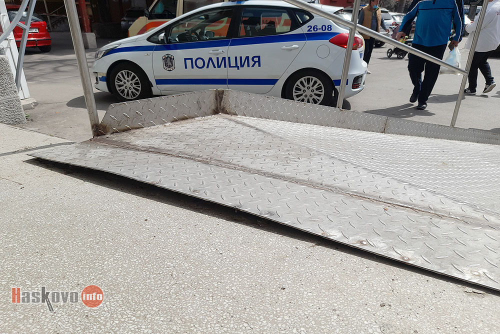 Изкривената рампа на входа на Спешно отделение на МБАЛ – Хасково затруднява движението на носилките и инвалидните колички.