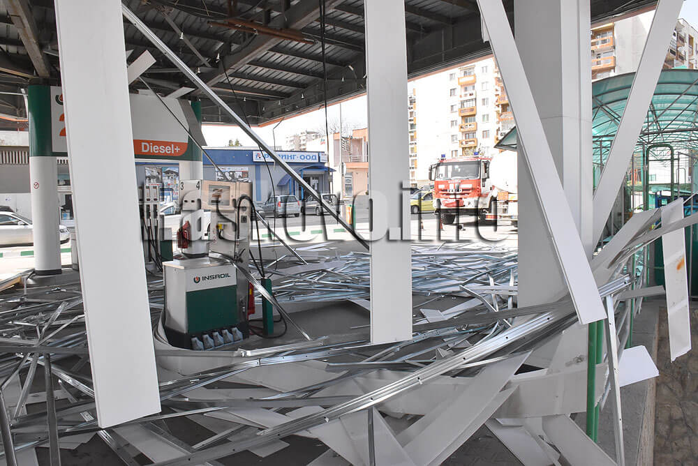 Паднал е основно окаченият таван над бензиноколонките. При падането на елементите от тавана няма пострадали хора или щети по автомобили. На място пристигнаха пожарникари, за да обезопасят района.