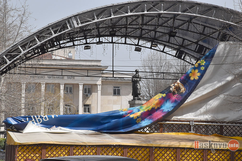 Силният вятър скъса винила на сцената на площад "Свобода" в Хасково.
