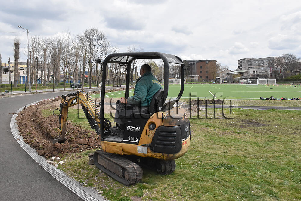 Багер разкопаваше днес мястото между изкуствения терен и пистата, където се монтира поливна система. Тя ще е за зелените площи край футболния терен. Монтират се и нови осветителни тела.