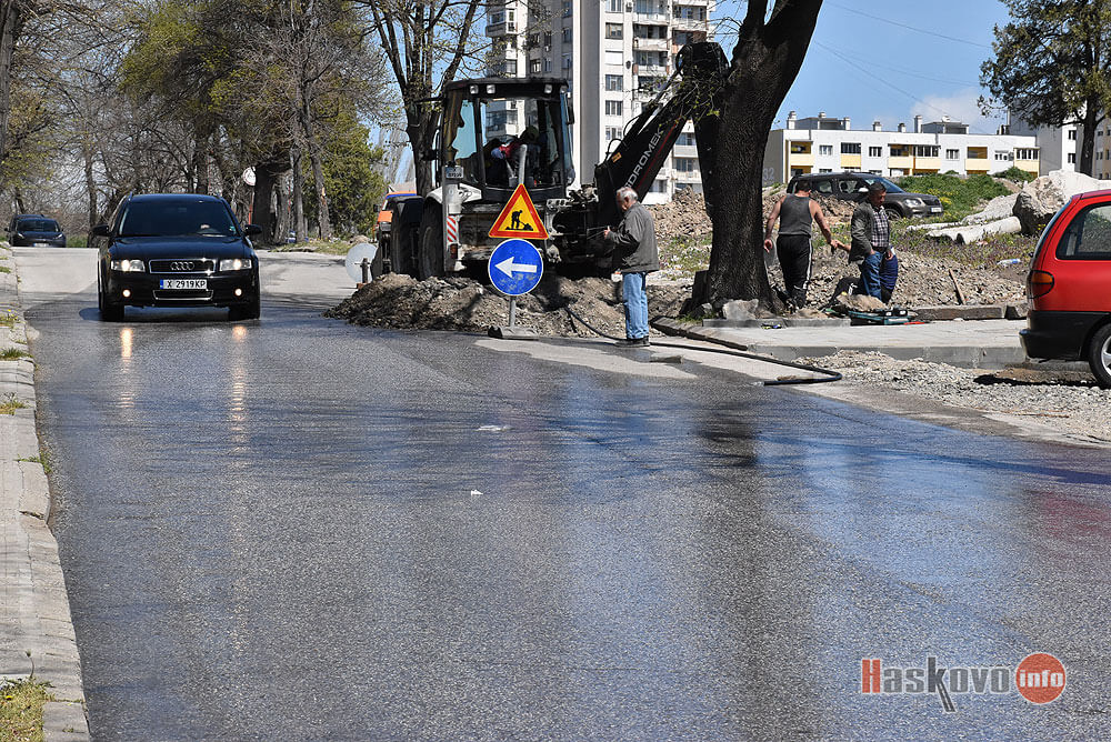 Вода се стича по хасковската улица „Булаир“ до кръстовището с булевард „Съединение“ заради продължаващото изграждане на канализацията на новия парк зад ДНА.