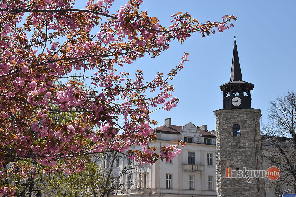 Цъфтящата японска вишна вече радва хасковлии до часовниковата кула в центъра.