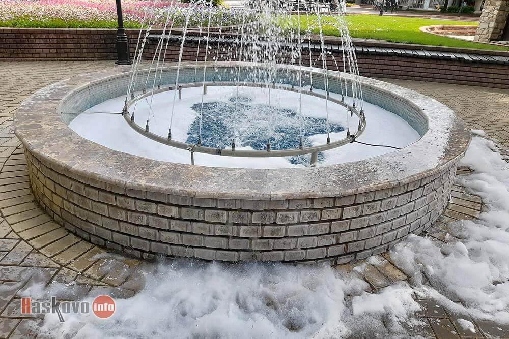 Шадраванът под часовниковата кула в центъра на Хасково е в пяна от почистващ препарат.