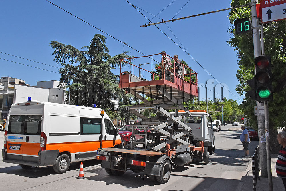 На място пристигна вишка с работници, които започнаха да отстраняват аварията. Очаква се малко по-късно да бъде възстановено движението на тролеите.