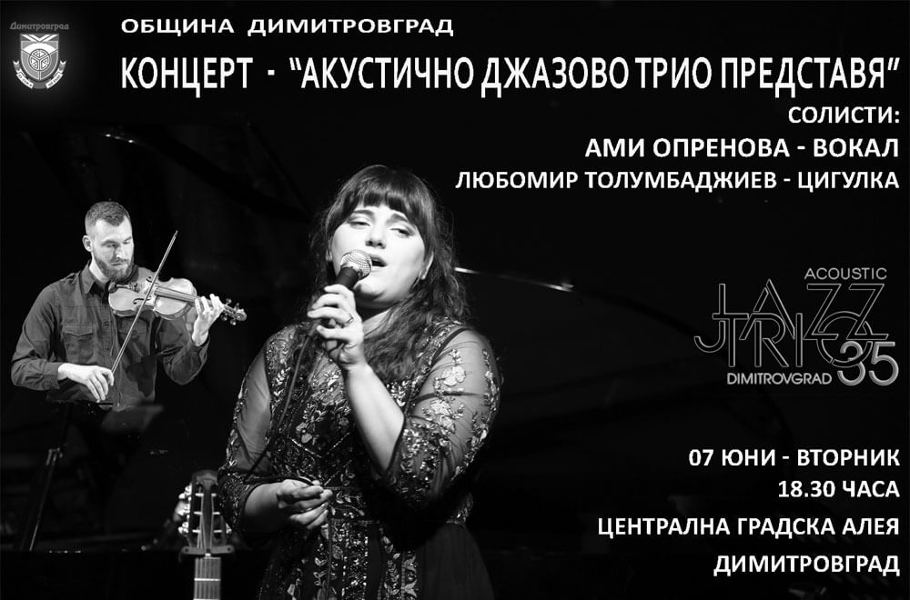 Първият от поредицата концерти „Акустично Джаз Трио Представя“ е на 7 юни от 18:30 часа на централната пешеходна алея в Димитровград, съобщават от общината.