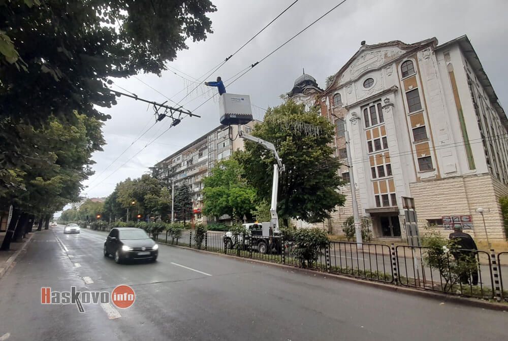 Работници с вишка поправиха разкачената от вятъра украса на булевард "Раковски" в Хасково.