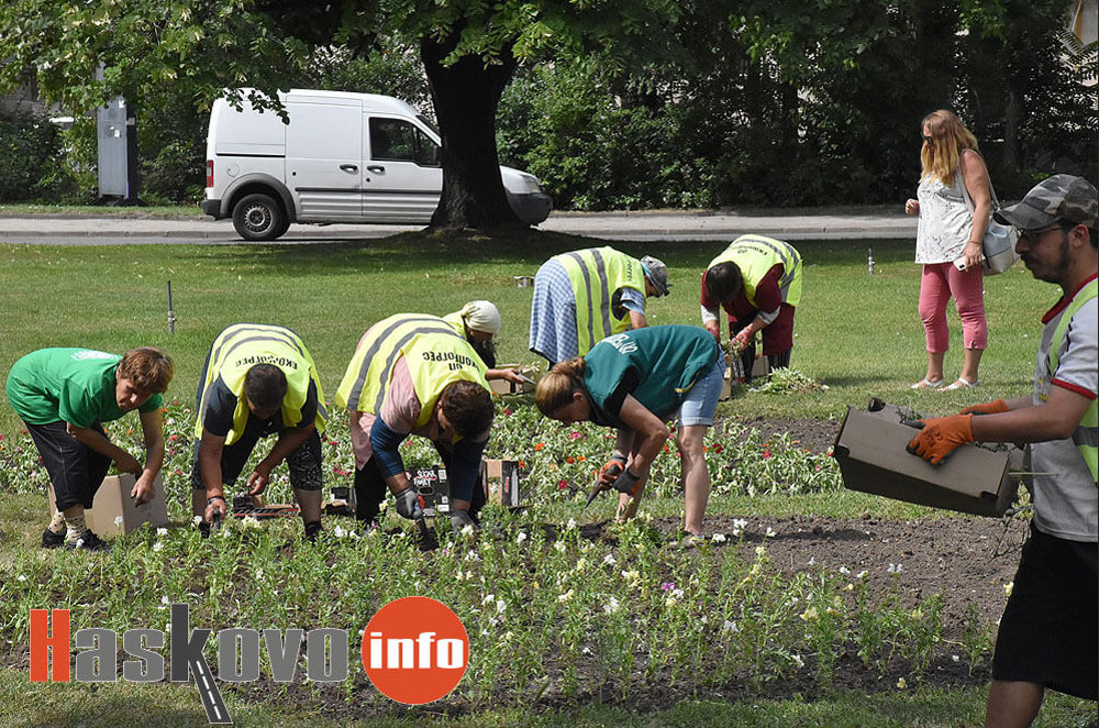Работници на "Екопрогрес" зацветяват поредната градинка в центъра на Хасково.
