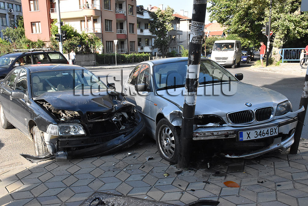 При удара двете коли допълнително са се ударили в тротоара и светофарната уредба.