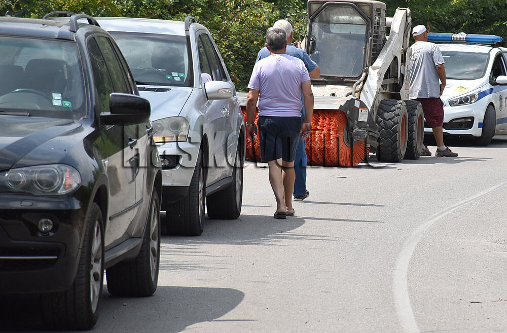 Покрай пътя се прокарват електрически кабели и движението в едната лента е затворено, като се преминават работници и строителна техника. Колите се пропускат от работници.