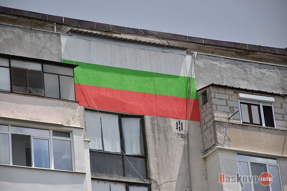 Живеещите в блок 71, вх. Б на хасковската улица „Георги Кирков“ са изрисували цветовете на българското знаме на мястото на ремонтирана част от фасадата. Трикольорът се вижда от километри.