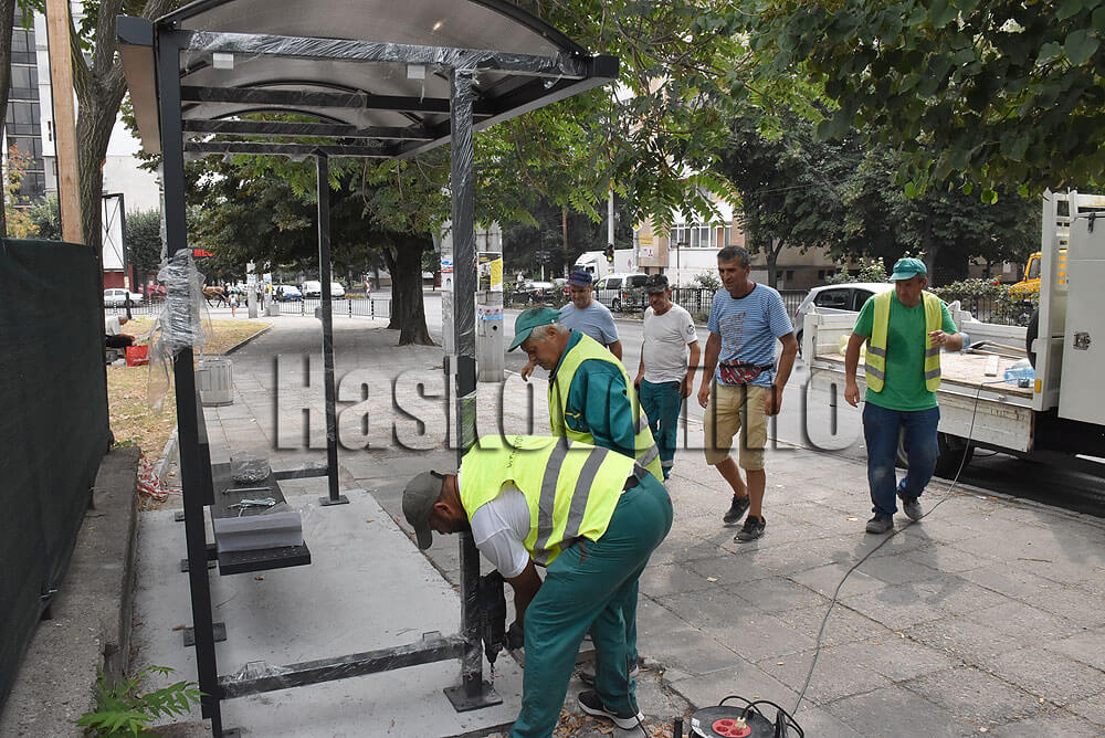 Започна монтажа на новите автобусни спирки в Хасково. Работници на „Екопрогрес“ отново поставиха част от съоръженията след корекции.