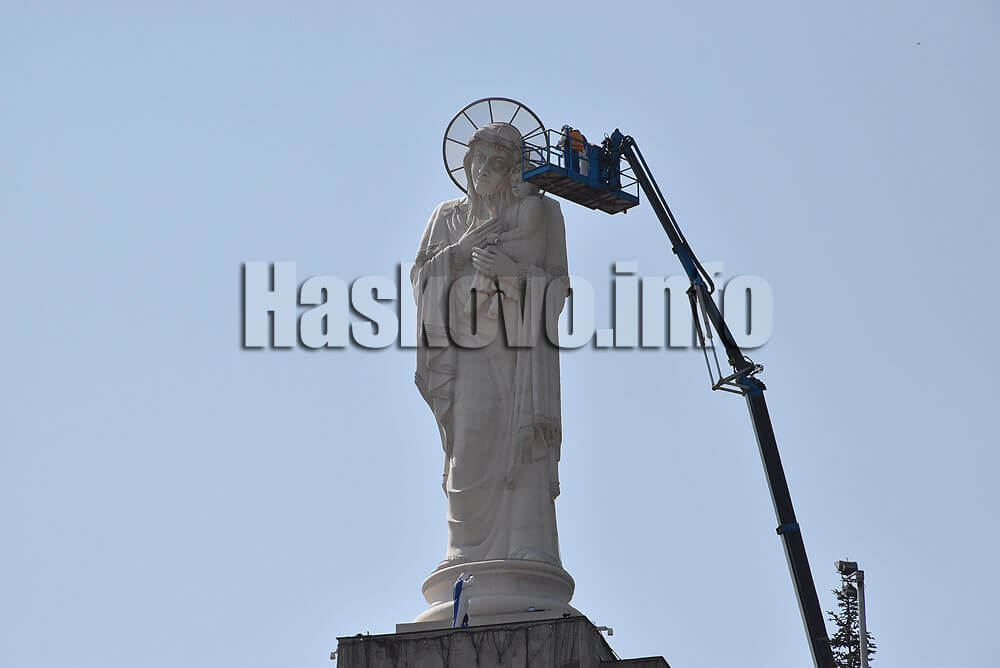 Работници с вишка извършват днес дейности по защита на статуята на Света Богородица в Хасково, съобщават от общината.