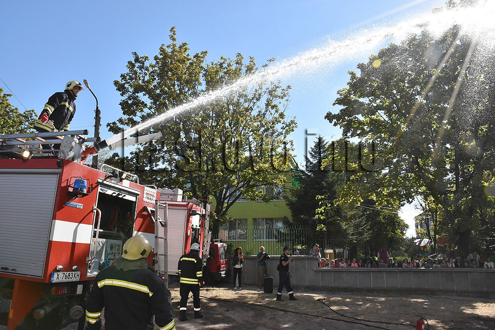 Хасковските пожарникари направиха атрактивна демонстрация на уменията си пред малчуганите от Детска градина №11 „Елхица“ в квартал „Република“. В градината се грижат за 100 деца.