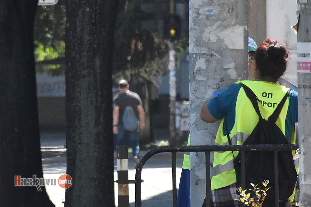 Служители на „Екопрогрес“ разчистват предизборните плакати, които партиите и кандидатите в Хасково са разлепили на забранени места.