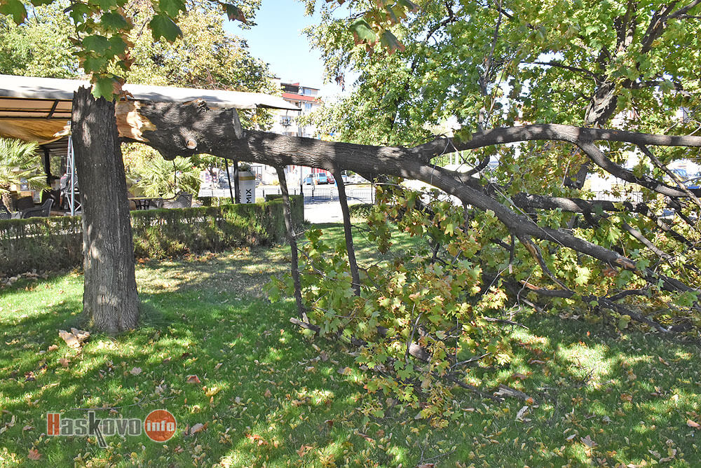 Силният вятър прекърши дърво в парка срещу площад "Лебеда" в Хасково.