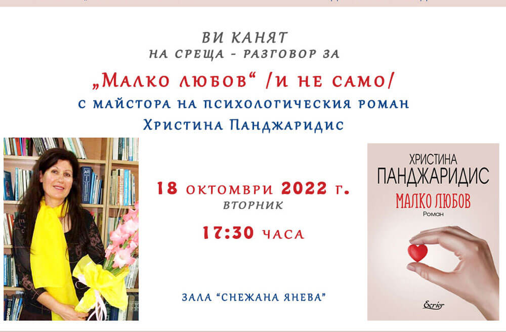 Градска библиотека „Пеньо Пенев“ и Клуб „Приятели на книгата“ към Народно читалище „Култура – 2002“ организират среща-разговор за „Малко любов“ с майстора на психологическия роман Христина Панджаридис. Представянето ще е на 18 октомври от 17:30 ч. в зала „Снежана Янева“ на библиотеката.