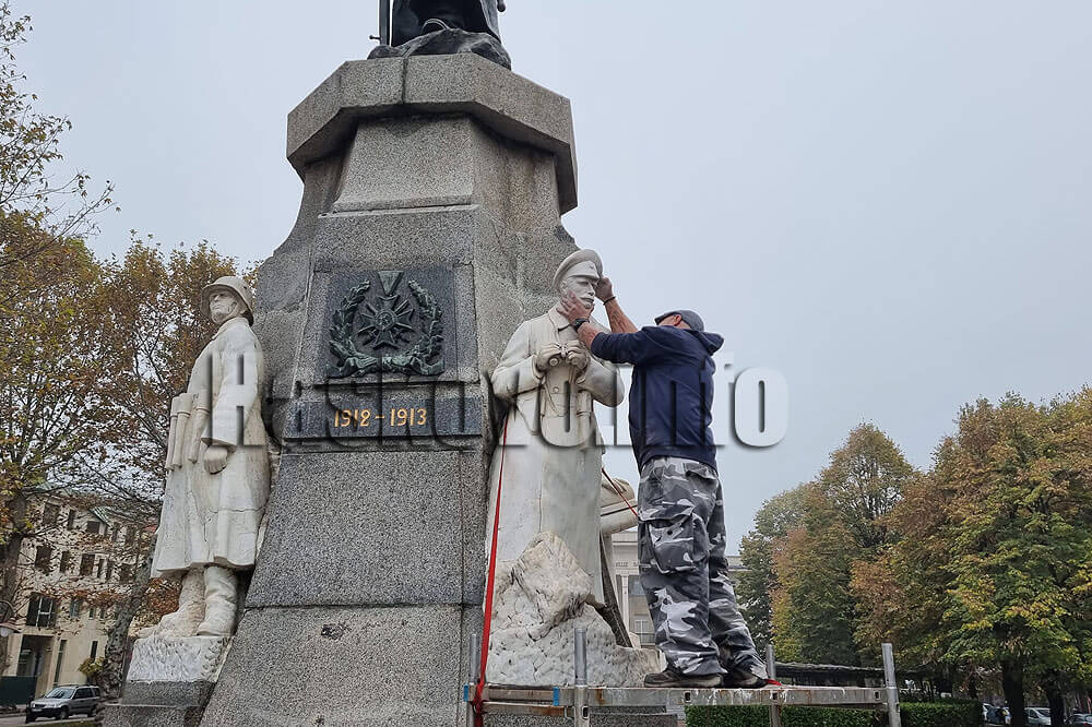 Екипът на скулптора Петър Александров възстанови днес откъртената глава от една от фигурите на паметника на Незнайния воин в центъра на Хасково.