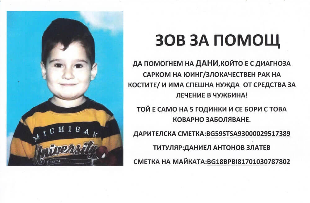 Детето страда от сарком на Юинг – злокачествен рак на костите. Дани има спешна нужда от средства за лечение в чужбина.