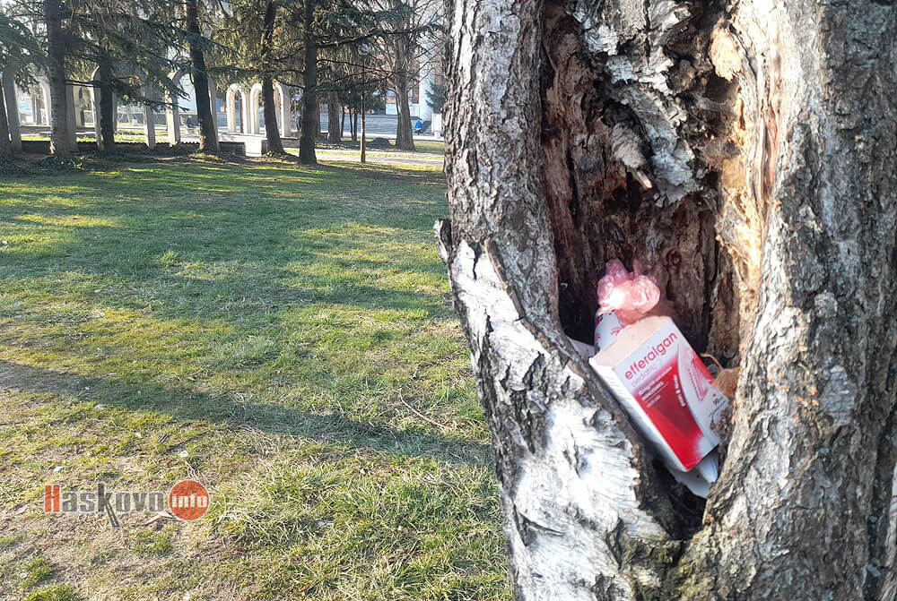Хралупата на една от брезите в градинката пред Бизнес центъра в Хасково е превърната в боклукчийско кошче.