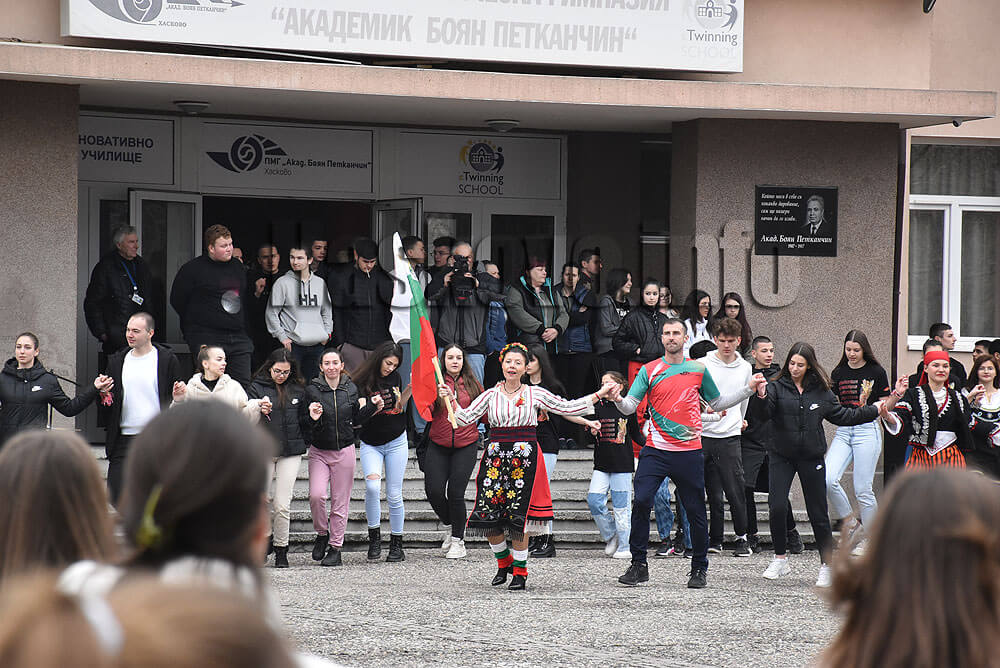 Ученици и учители извиха голямо хоро в двора на ПМГ „Акад. Боян Петканчин“ в Хасково.