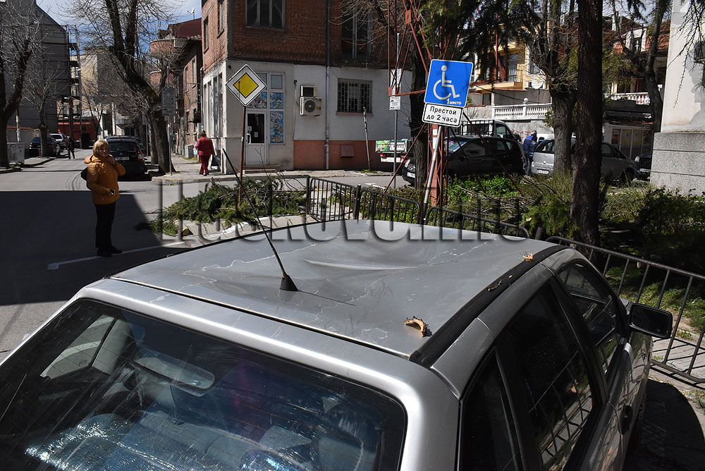 Дърво падна по обяд върху паркиран лек автомобил в синята зона на улица „Цар Калоян“ в Хасково.